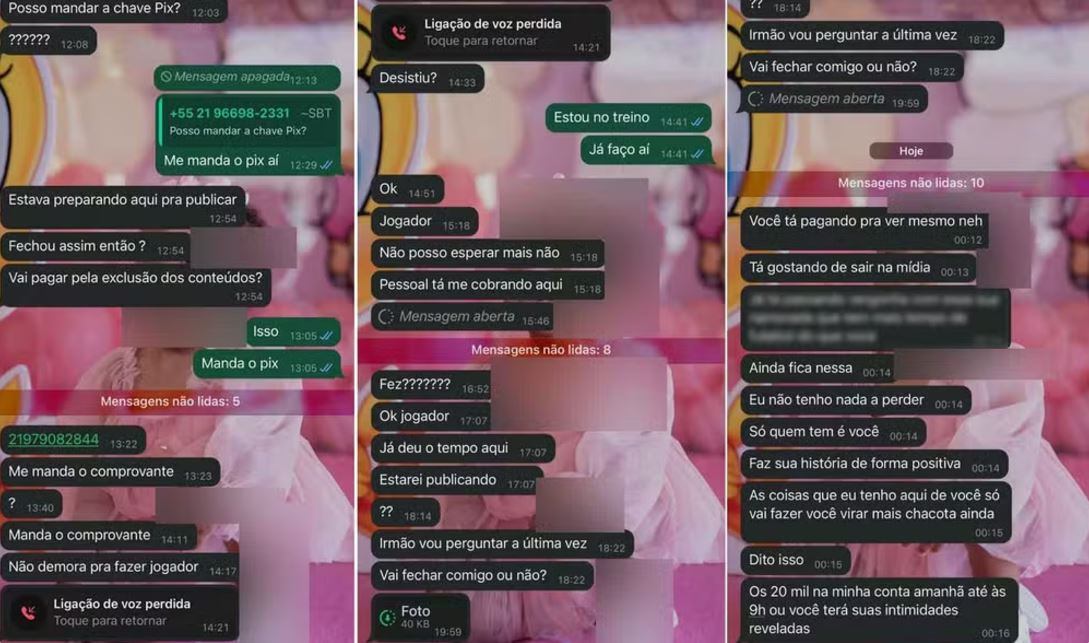 “Ok jogador, não posso esperar mais não. Pessoal tá me cobrando aqui (...) Você tá pagando mesmo para ver. Tá gostando de sair na mídia (...) Eu não tenho nada a perder. Quem tem é você. Faz tua história de forma positiva. As coisas que eu tenho aqui de você só vai fazer você virar mais chacota ainda. Dito isso, os 20 mil na minha conta até amanhã às 9h, ou você terá suas intimidades reveladas”.