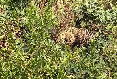 Um vídeo registrou o momento em que uma onça captura um jacaré com um golpe mortal em apenas segundos durante uma caçada selvagem.